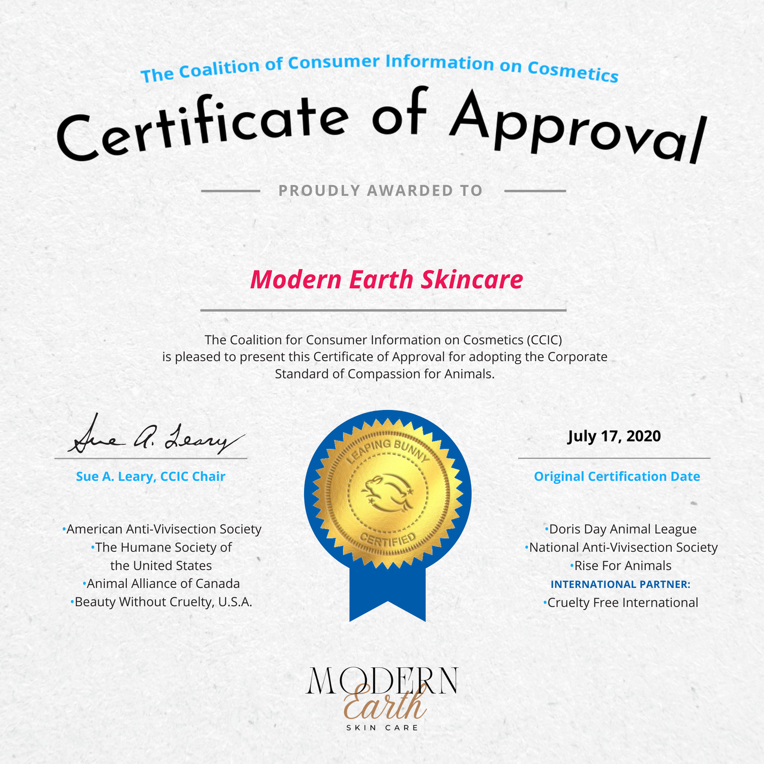 At Modern Earth Skincare® we believe that skincare should be kind to your skin, the planet, and all living things. That’s why we are proud to be and maintain our Leaping Bunny Certified status from the very beginning, ensuring that our products are 100% cruelty-free. This means no animal testing at any stage of our formulations, from ingredients to the final product!